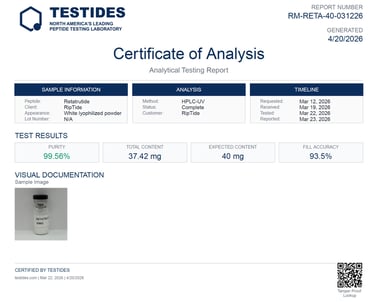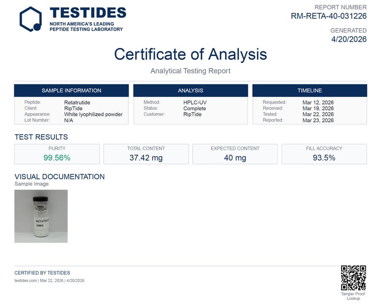 By working exclusively with Testides, we ensure every vial of peptides that goes into your RipTide Kit is independently verified for identity, purity, and potency — consistently hitting 99%+ purity.